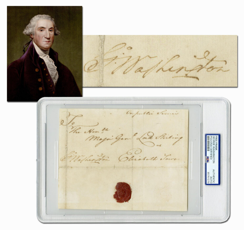 Lot 143 was a George Washington free frank signature on a transmittal cover also bearing his personal red wax seal: the Washington coat of arms encircled within a wreath border. Written from Elizabeth, New Jersey, ca. 1778-1780, the cover was addressed to William Alexander, Lord Stirling, one of Washington’s most trusted generals in the Continental Army, and whom Washington had appointed as interim leader during the second Middlebrook encampment. The Washington free franked cover was PSA/DNA certified and encapsulated, selling for 30% over the high estimate, or $16,250 including the tip.