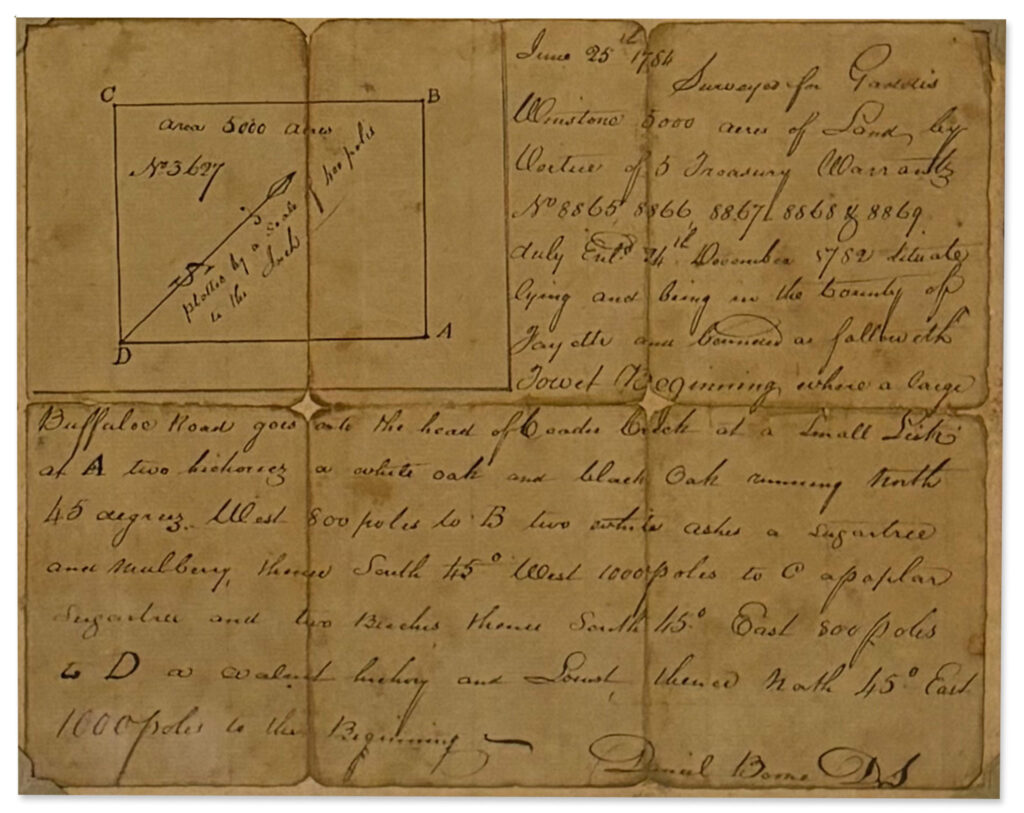 Lot 427 is an autograph document signed and plat map entirely executed in Daniel Boone’s hand, in his role as District Surveyor of Lafayette County, in present-day Kentucky. Boone outlined the extent of landowner Gaddis Winston’s 5,000-acre property on June 25, 1784, the same year the John Filson’s The Discovery, Settlement and Present State of Kentucke was published. Filson dedicated a large portion of his book promoting Kentucky settlement to Boone, thus becoming the first author to mythologize Boone as the quintessential American frontiersman.