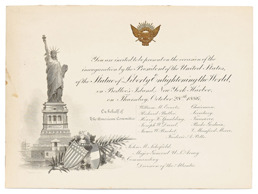 Lot 338 was an elegant Tiffany & Co. engraved invitation to attend the inauguration of the Statue of Liberty on Bedloe’s Island, New York Harbor, on October 28, 1886. This charming example sold for over 200% of its high estimate, or $4,375 including the tip.