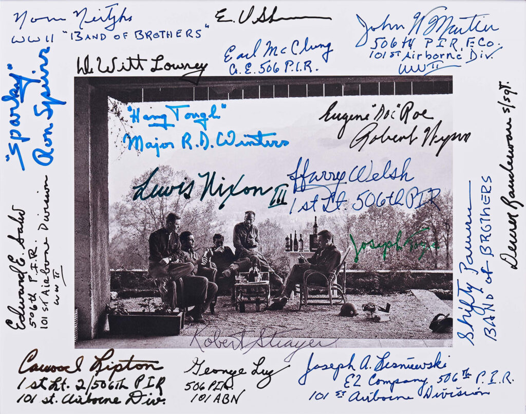 Lot 344 was a photograph signed by 18 members of the “Band of Brothers”: veterans of Easy Company, 2nd Battalion, 506th Parachute Infantry Regiment, 101st Airborne Division, including commander Dick Winters. The photograph shows the unit celebrating the capture of Adolf Hitler’s “Eagle’s Nest” in the Bavarian Alps. The signed photo sold for $9,375 including the buyer’s premium – a company high record for the same item.